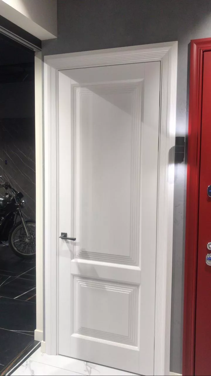 Элегантная дверь с экспрессивными формами. В ее стиле при кажущейся массивности присутствует необычная легкость. Строгие формы фрезерованных дверных панелей удивительным образом сочетаются с широкими наличниками трапециевидной формы, создавая уникальную композицию, которая вызывает подлинное восхищение.